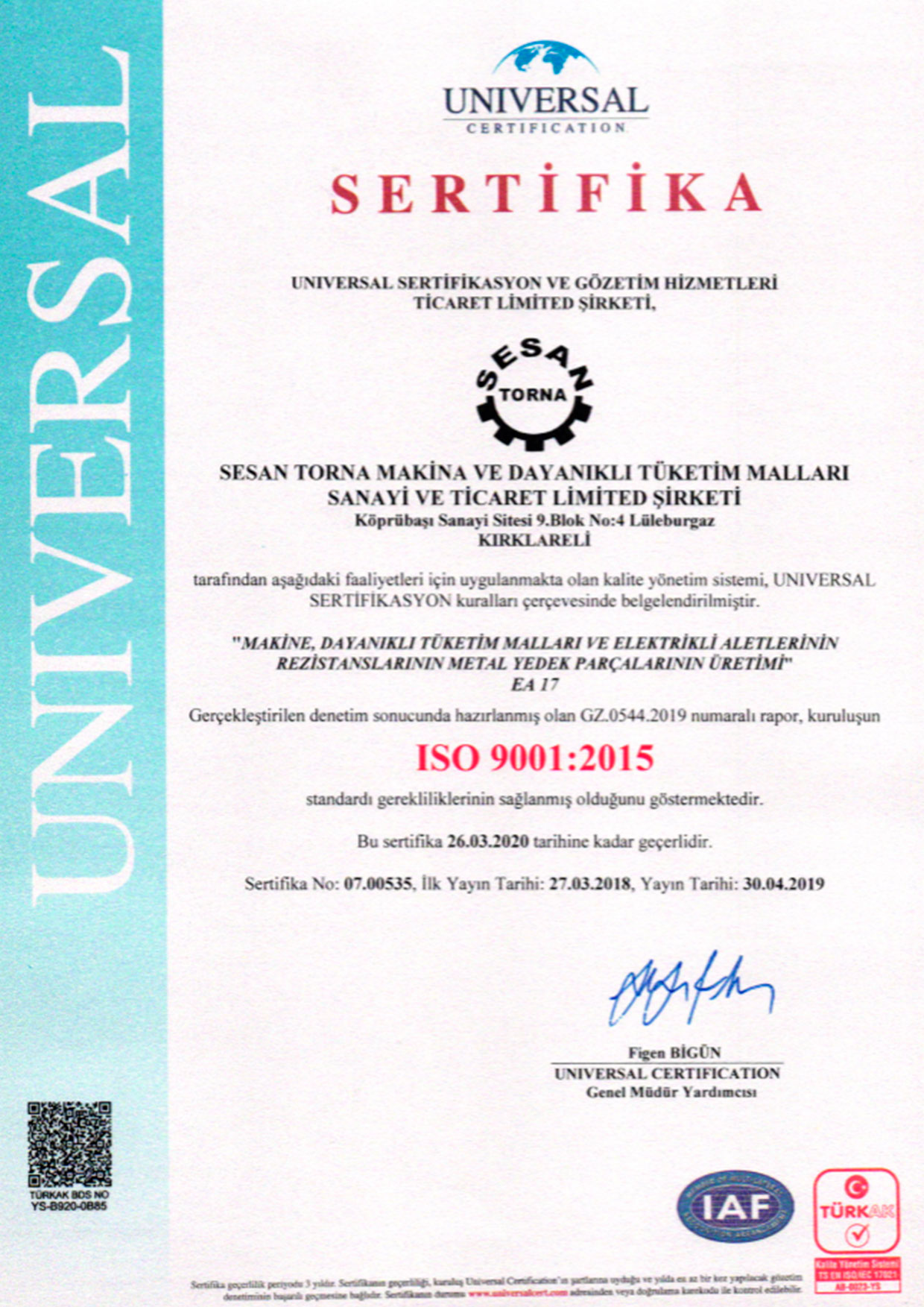 ISO 9001:2015 Sertifikasına sahip olan firmamız her işinde kaliteyi gözetmeksizin hizmet vermektedir.